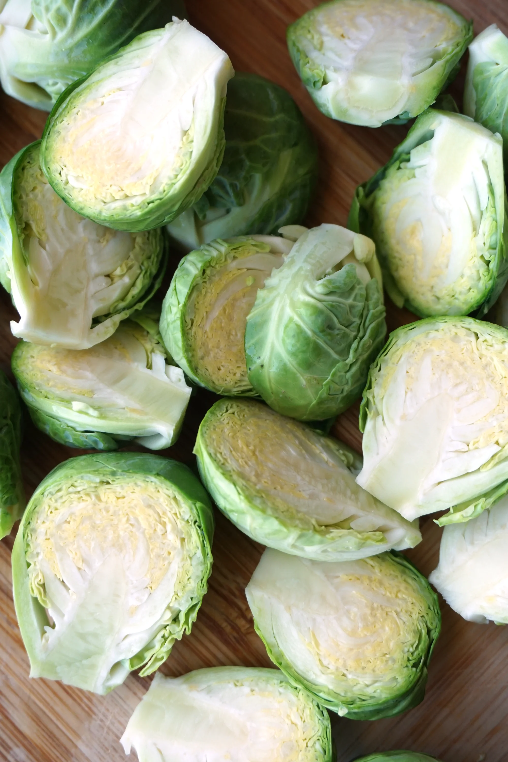 - Rinse the Brussels and remove any tough outer leaves from each sprout. Use a paring knife to trim off the ends. Cut each Brussels Sprout in half.