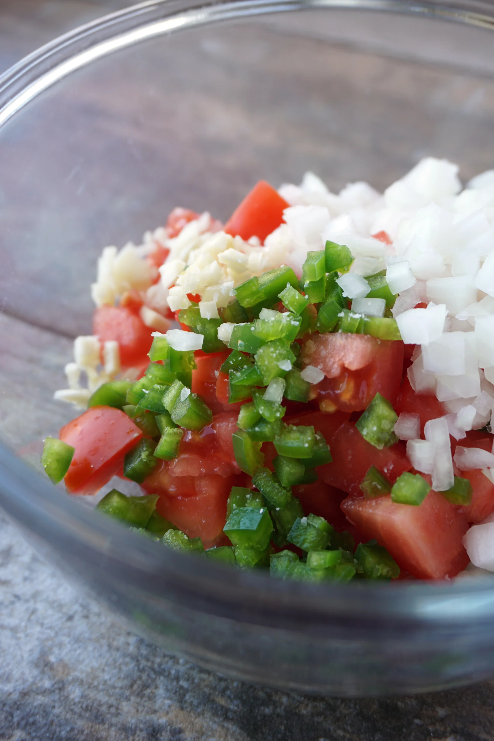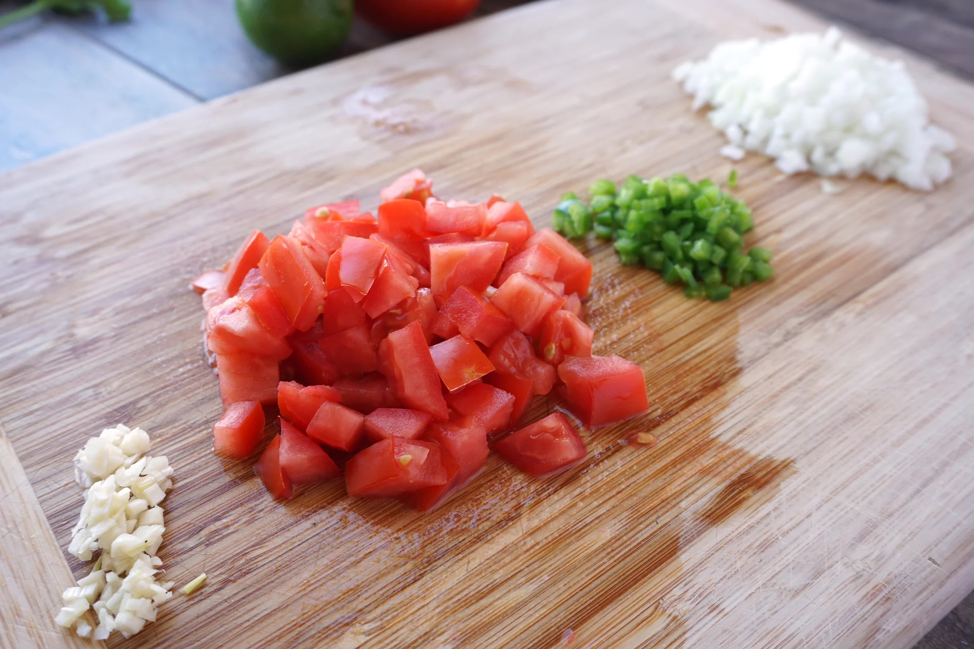 - Seed and dice the tomatoes and jalapeño. Dice 1/2 white onion and 1 clove of garlic. Toss together in a bowl with a few squeezes of lime juice. Season to taste with Kosher salt.