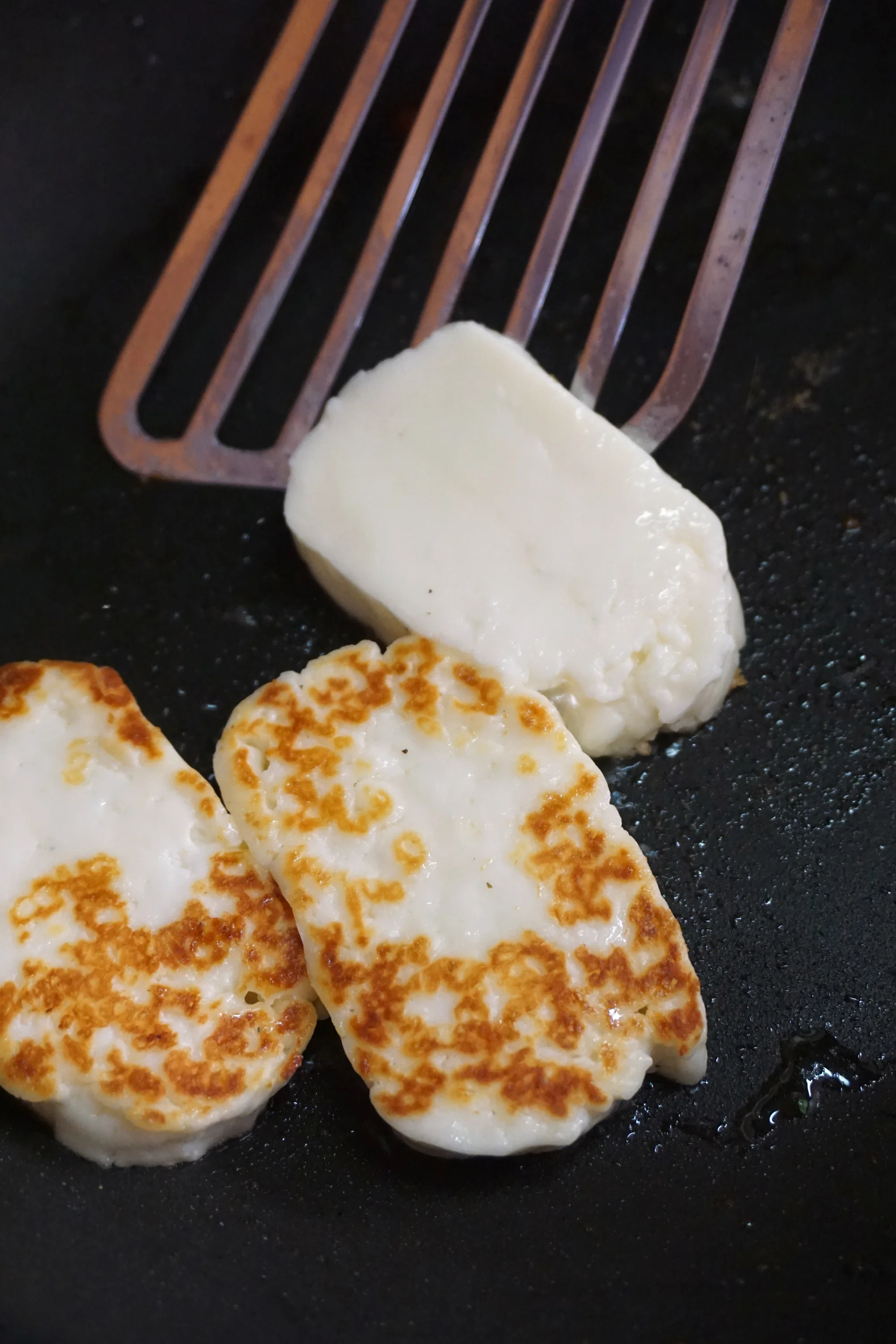 - Heat a skillet or grill over medium-high heat. You can drizzle a bit of evoo in the pan if you wish. Sear the Halloumi until the outside gets nice and crispy...perfectly golden brown. Try to only flip the cheese once!