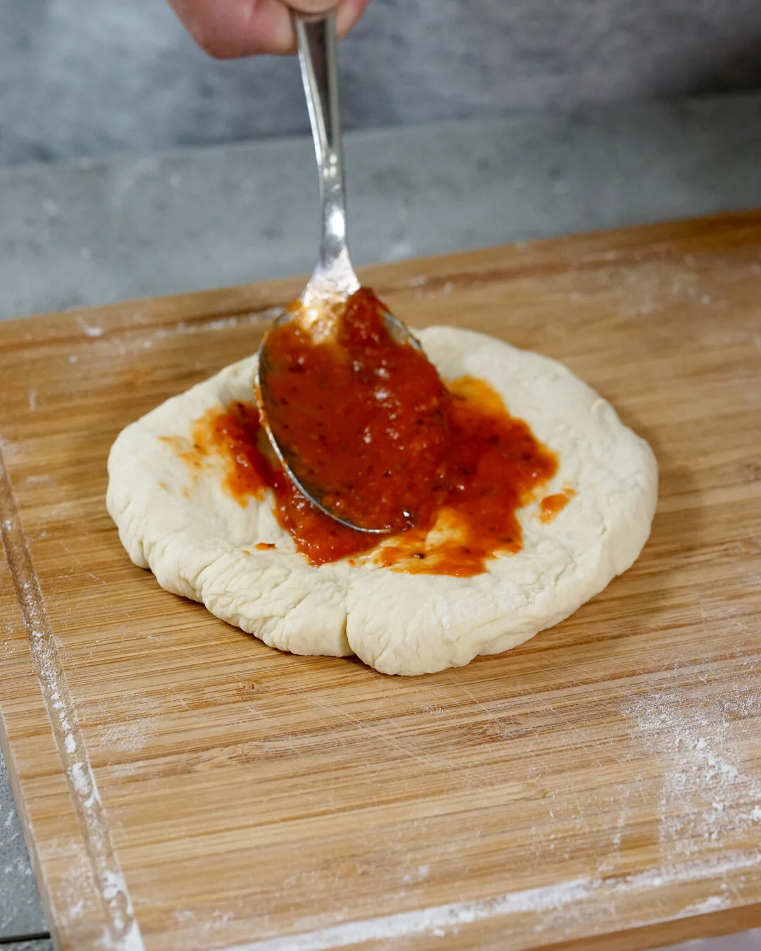 Spoon and spread some marinara sauce onto the dough, and add your favorite toppings!