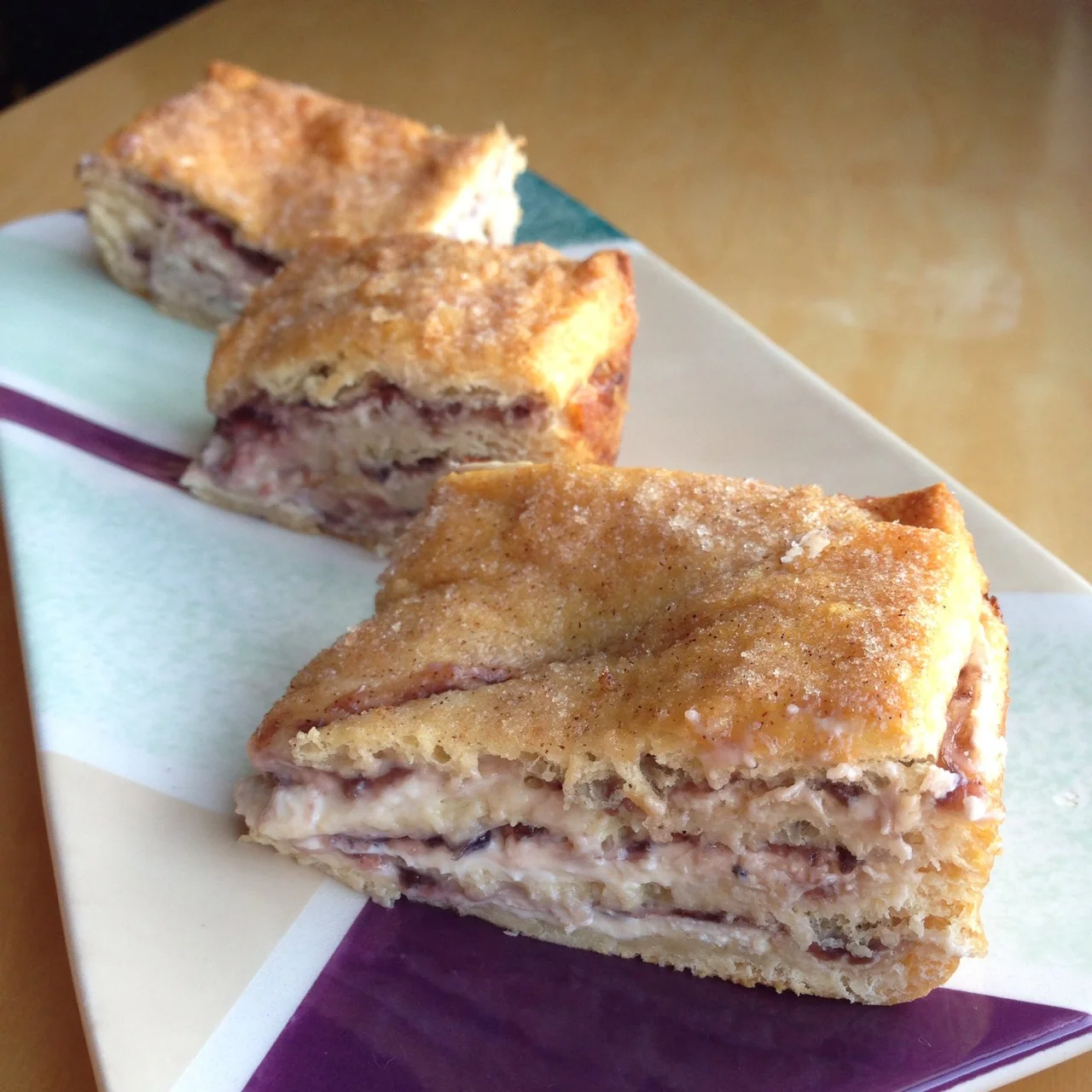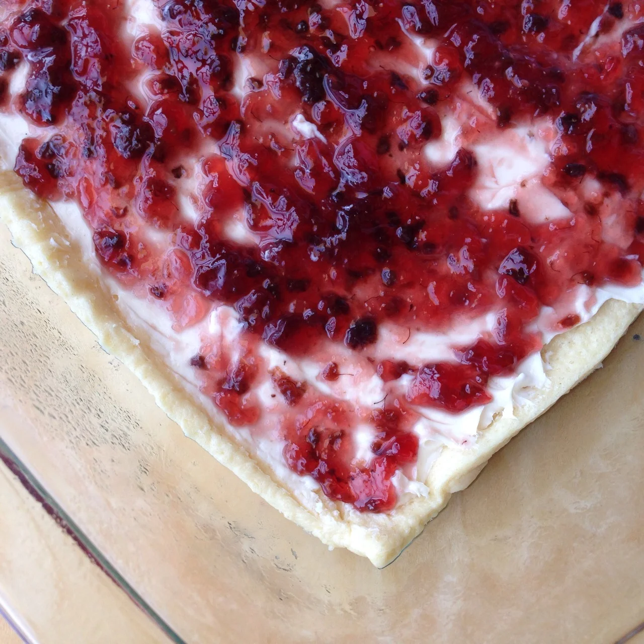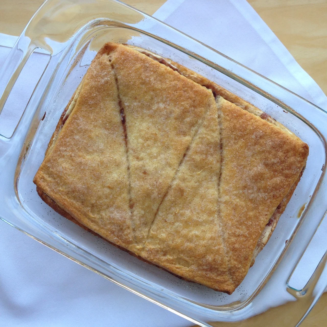 - I continued and did one more layer or cream cheese/raspberry jam, and then covered it all with a last layer of dough. Give it a spritz of cooking spray or butter. Cover the top of your creation with the cinnamon/sugar mixture.
