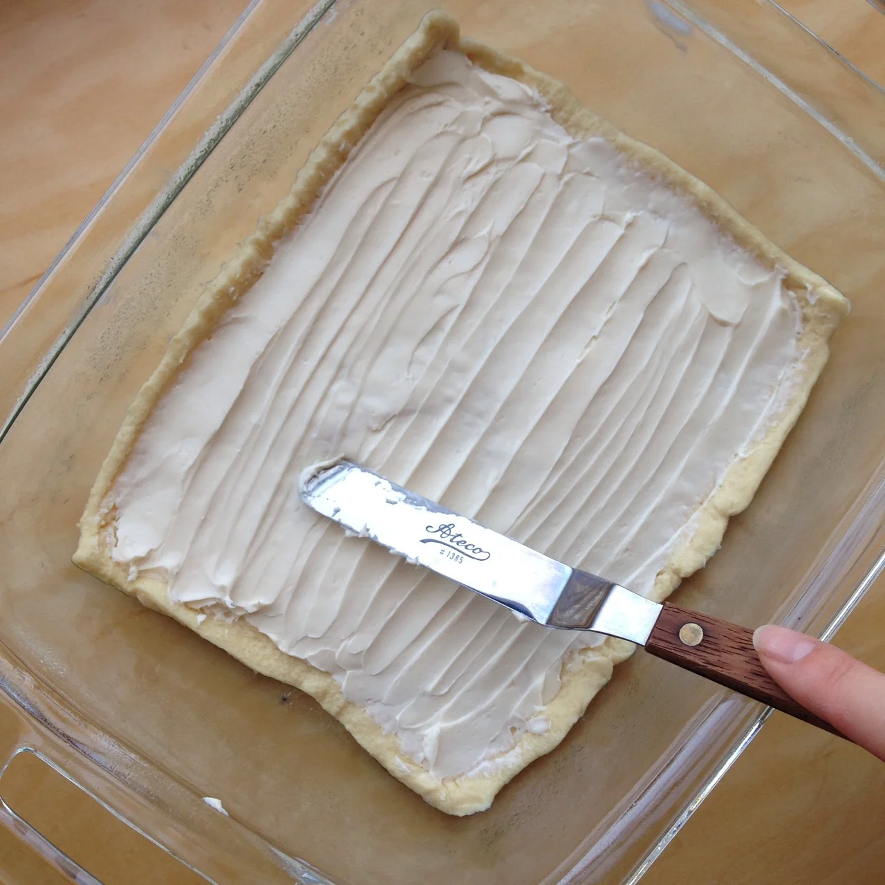 - Spread this mixture over the crescent dough. An offset spatula is extremely helpful in this case if your pan has high walls! :)
