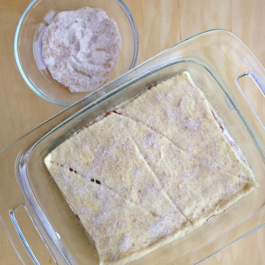 - Lay a second layer of crescent dough over this mixture. If you want to stop here, mix the remaining sugar with this cinnamon and sprinkle over the top.