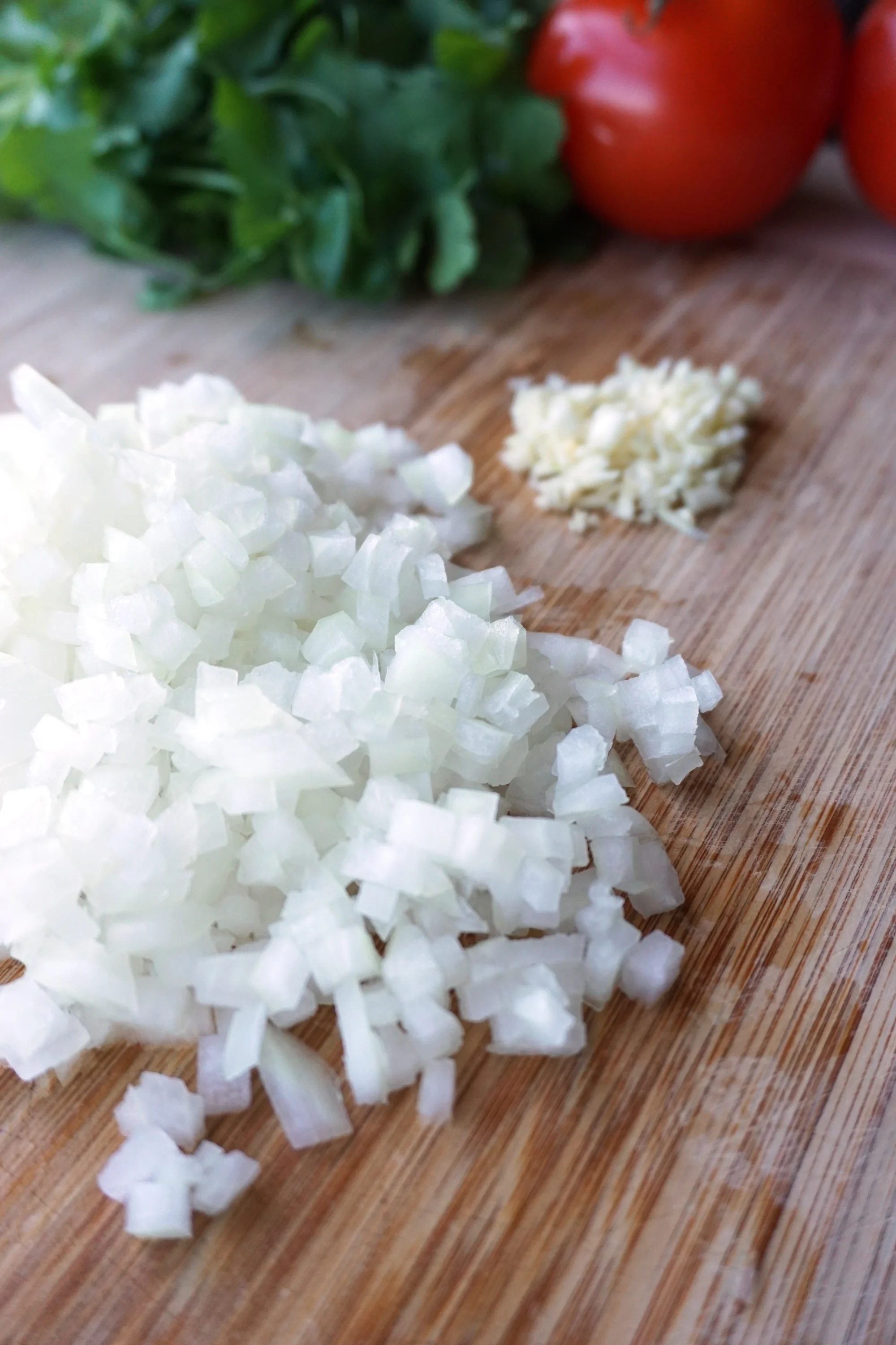 - Dice half an onion and 2 cloves of garlic.