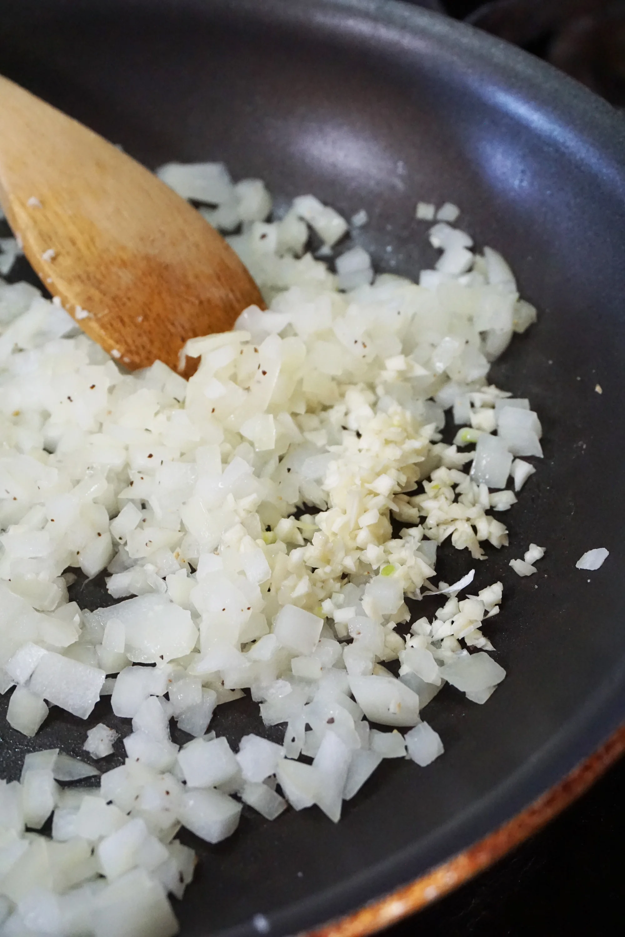 - Heat a medium skillet over medium heat with a drizzle of EVOO. Dump in the onions and allow them to slowly soften. Add in the garlic as they start to turn translucent. Season with salt and pepper.