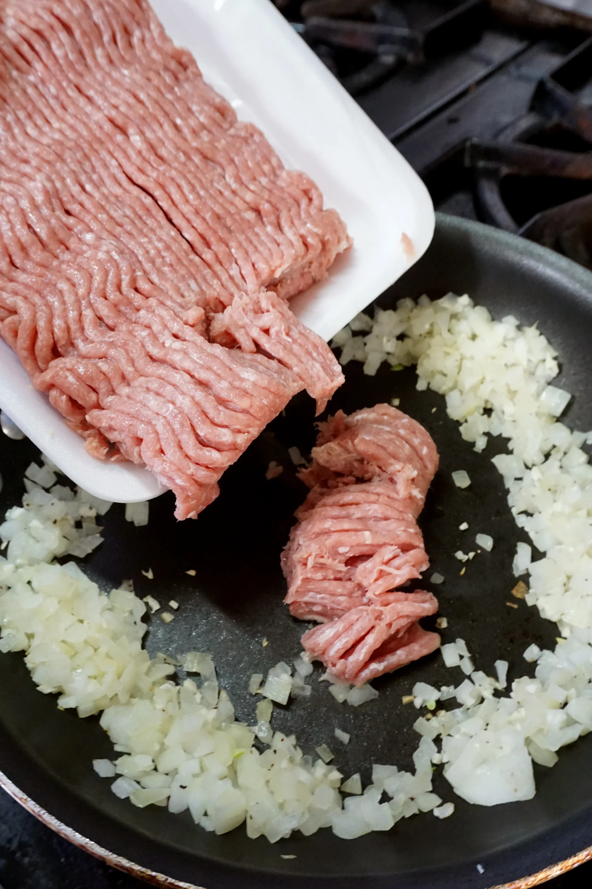 - As the onions turn clear, add the ground turkey into the pan and break it up with a wooden spoon. Season it with the taco seasoning mixture and continue to stir it all together until it’s incorporated.
