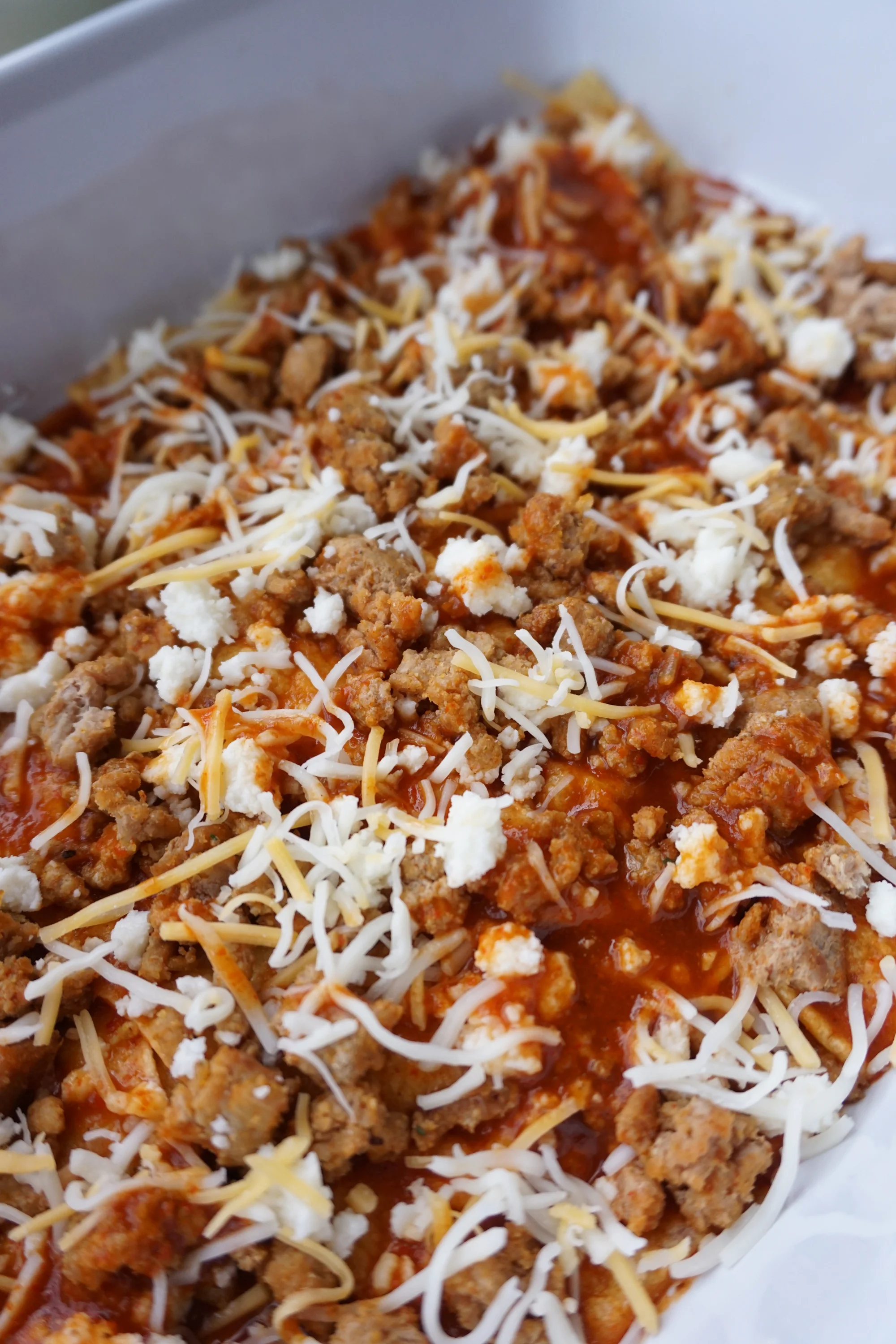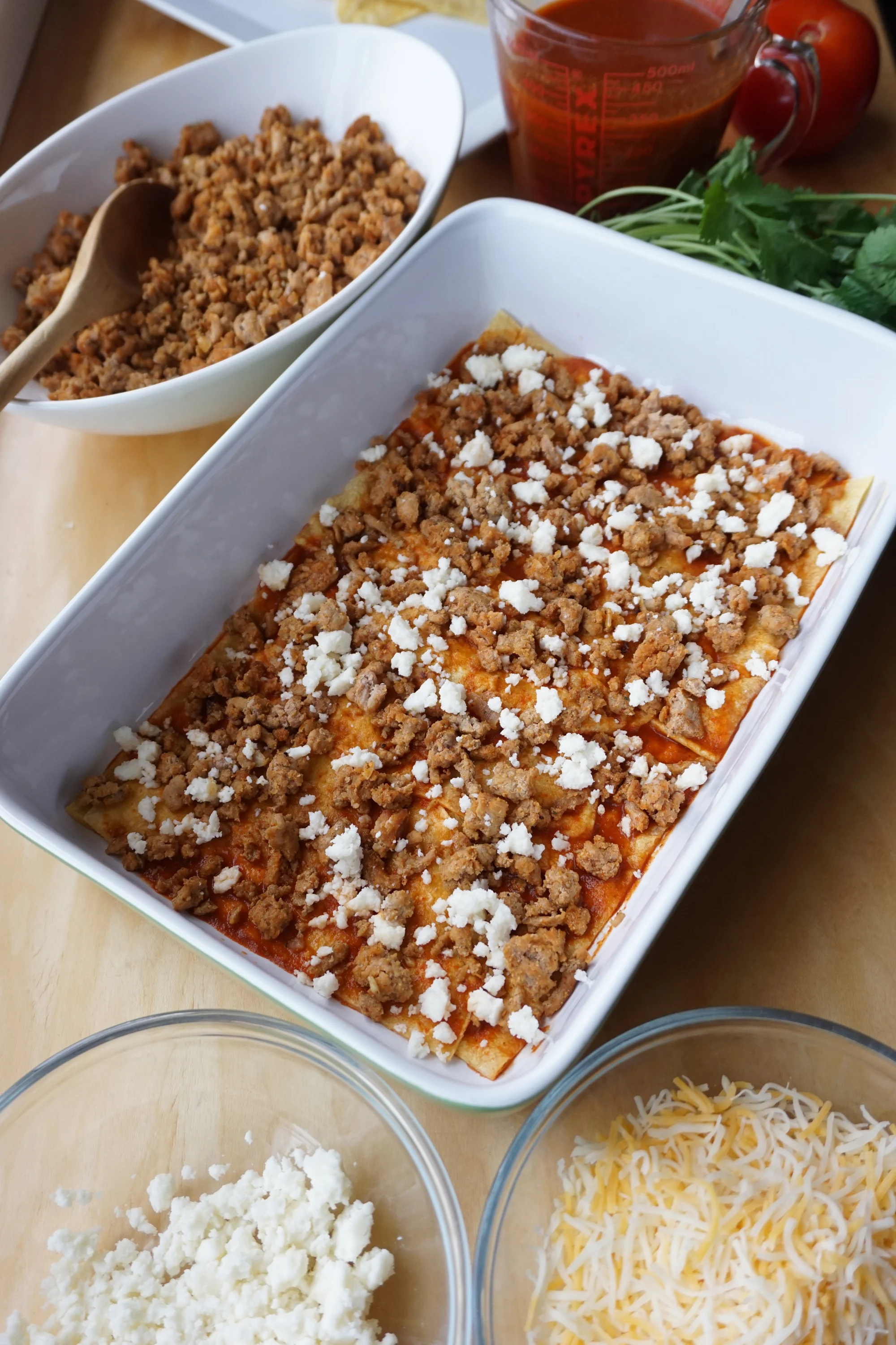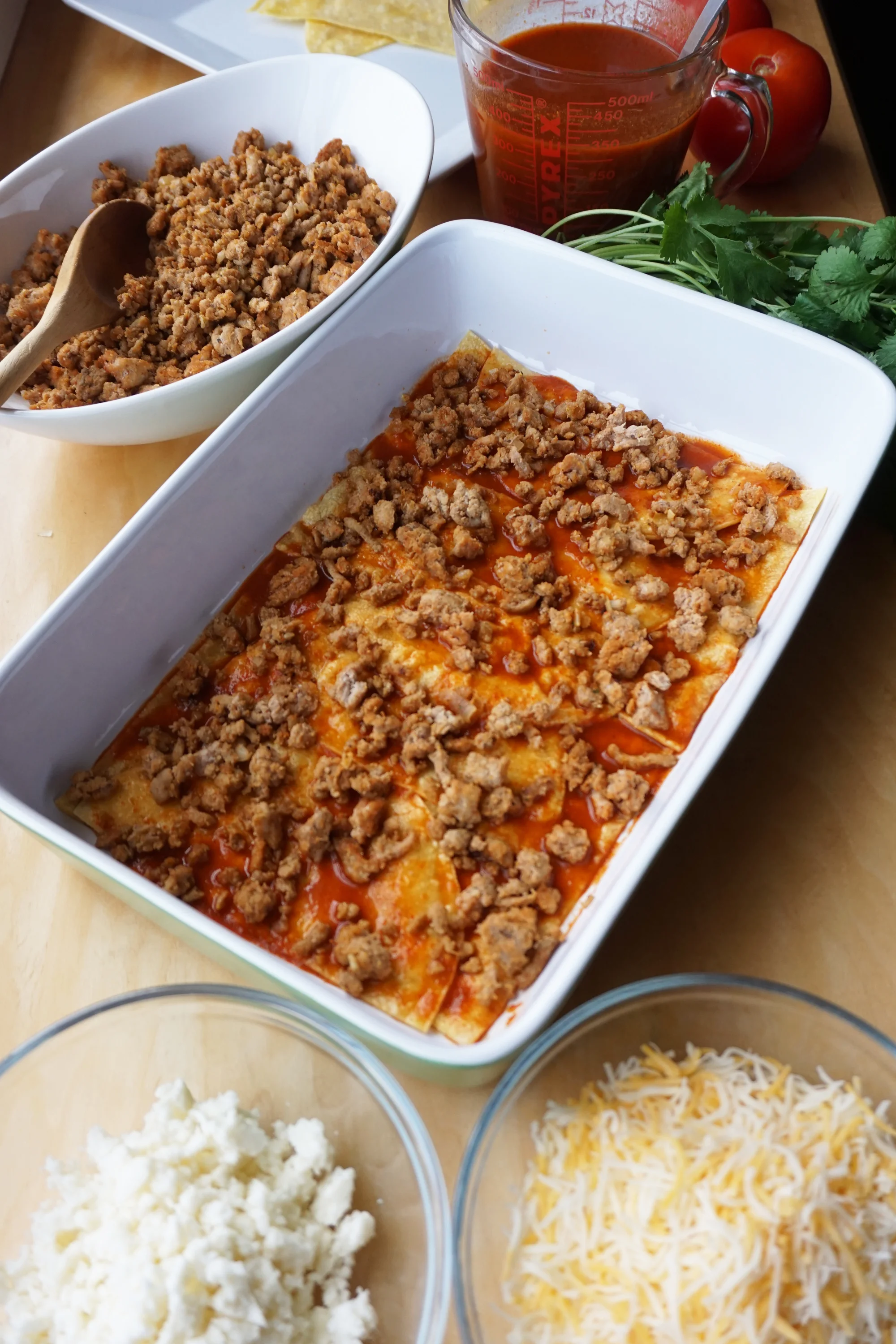 - Next, a layer of ground turkey, then queso fresco, then shredded cheese and more sauce.