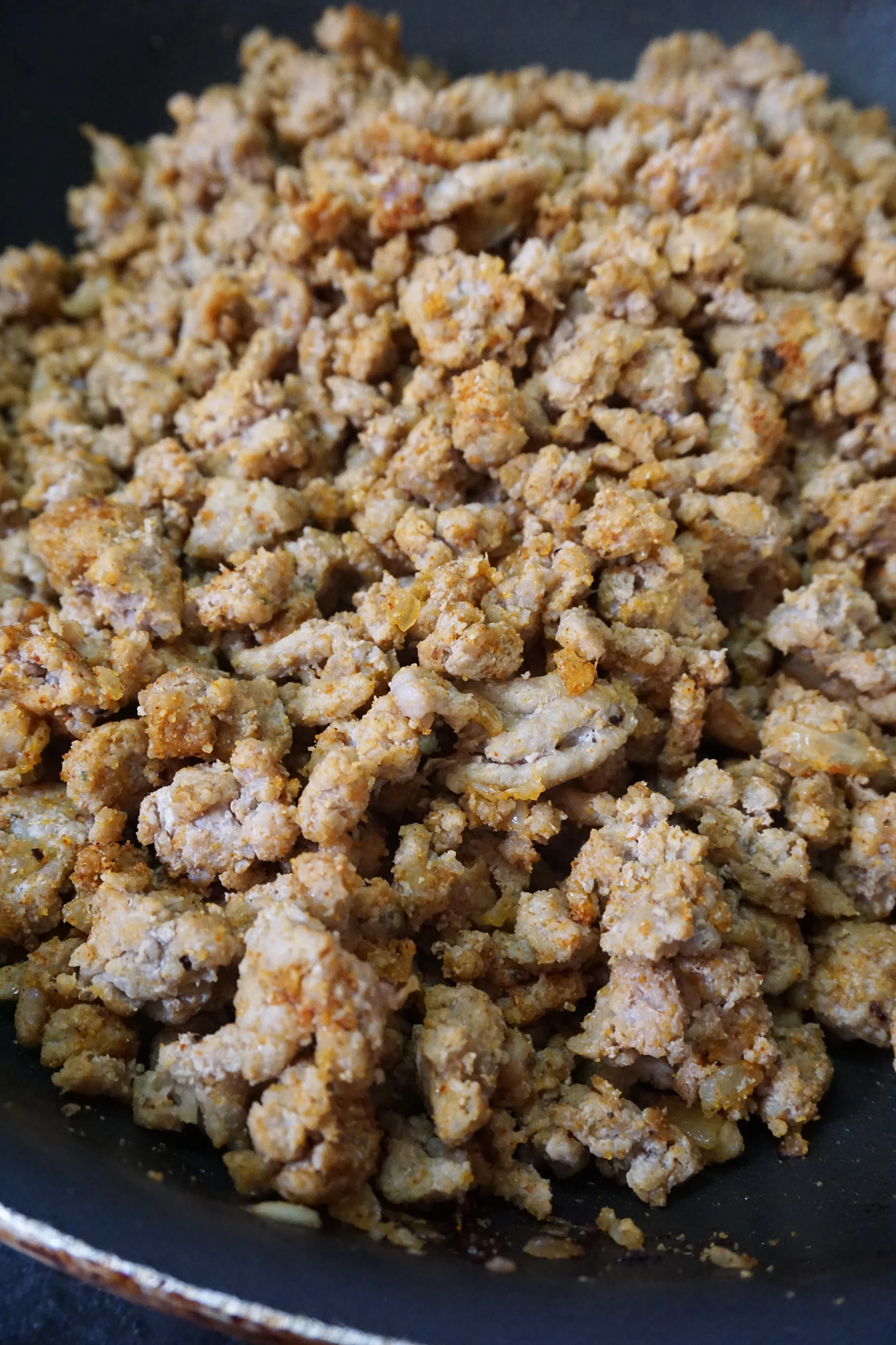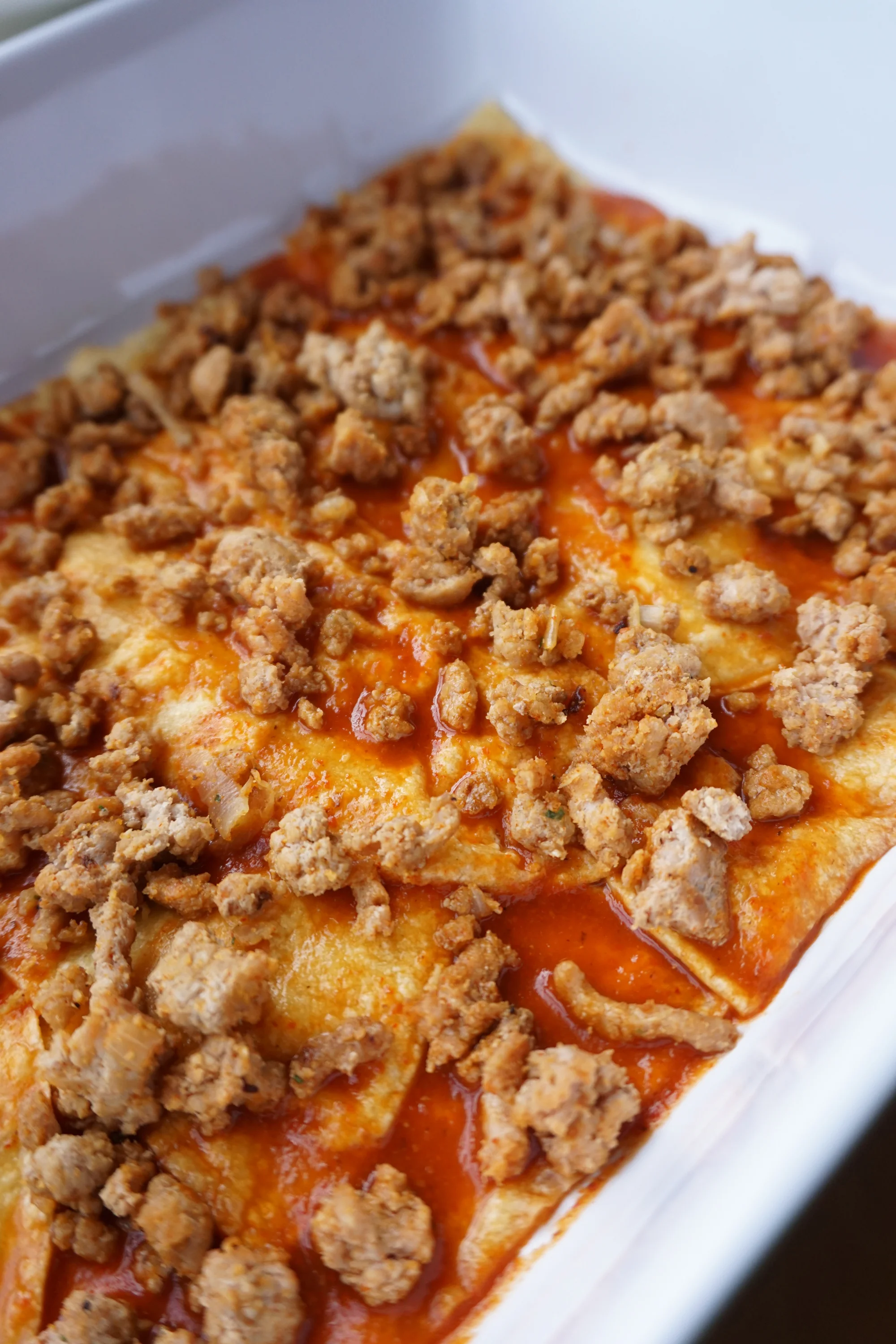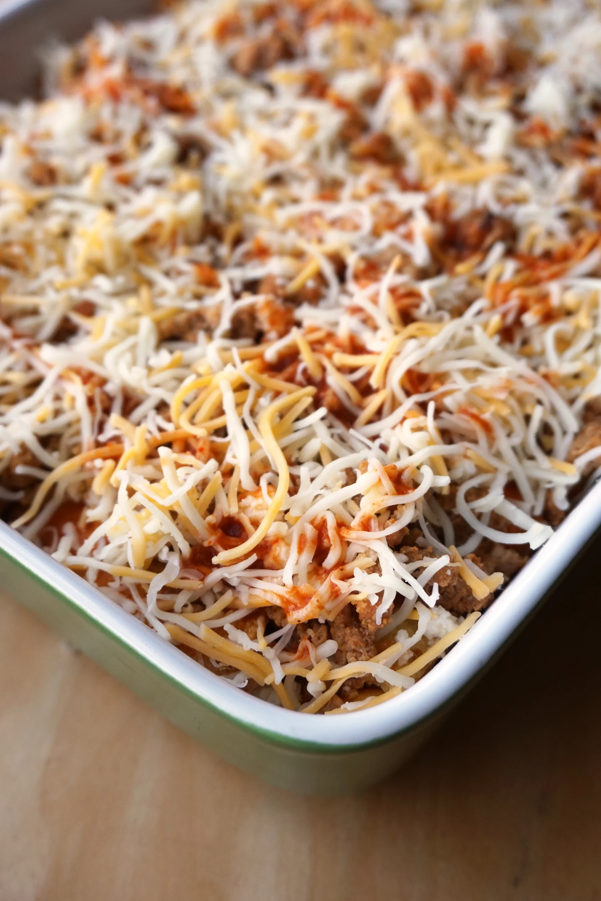 - Next, a layer of ground turkey, then queso fresco, then shredded cheese and more sauce.