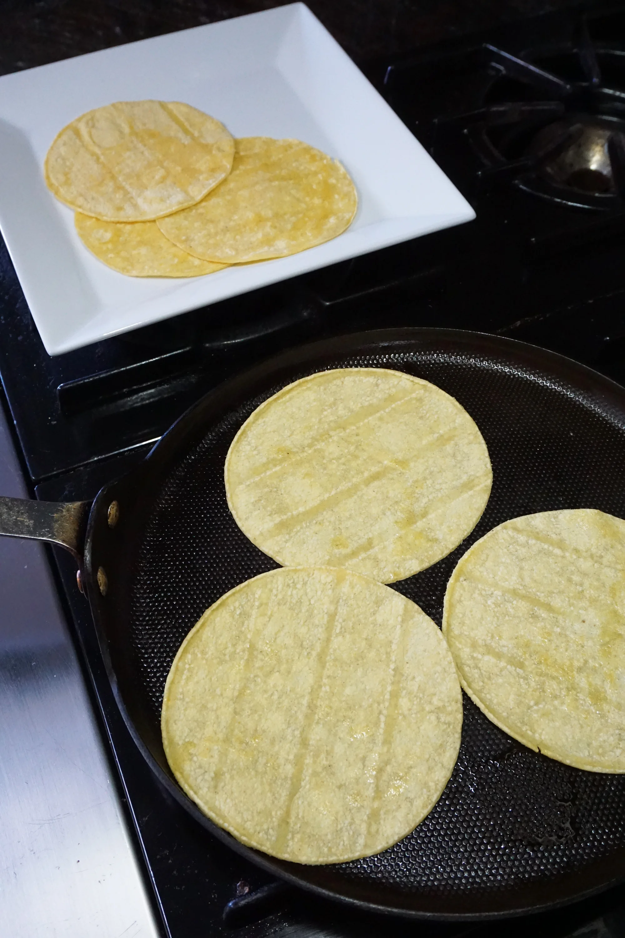 - I had asked my friend for advice on making these as authentic as possible. One of his tips was to make sure you warm up the tortillas before placing them in the baking dish. He said that raw tortillas don’t cook up well when wet. So, on a nice flat pan, gently warm up the tortillas. If you were to make classic enchiladas, this also helps prevent tearing when you’re rolling them up.