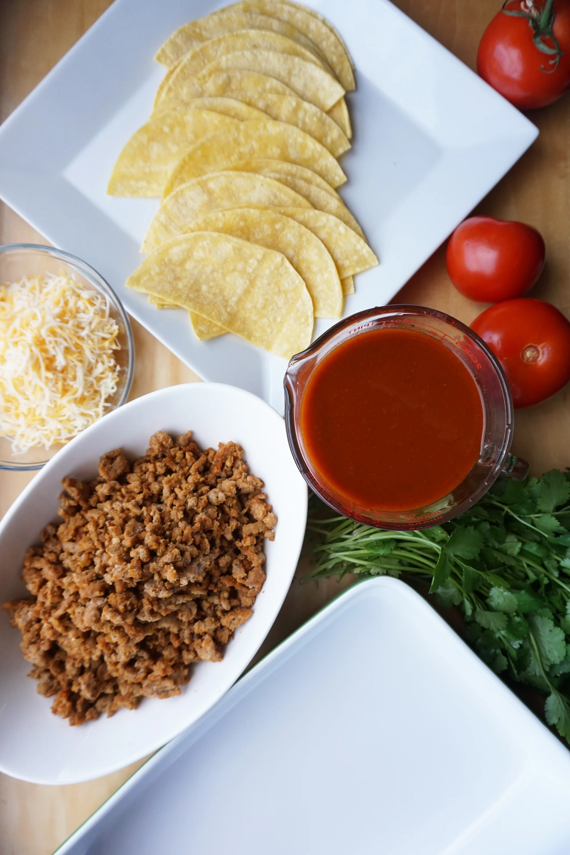 - Set up a nice little working station with your tortilla halves, shredded cheese, queso fresco, cooked turkey, enchilada sauce, and baking dish.