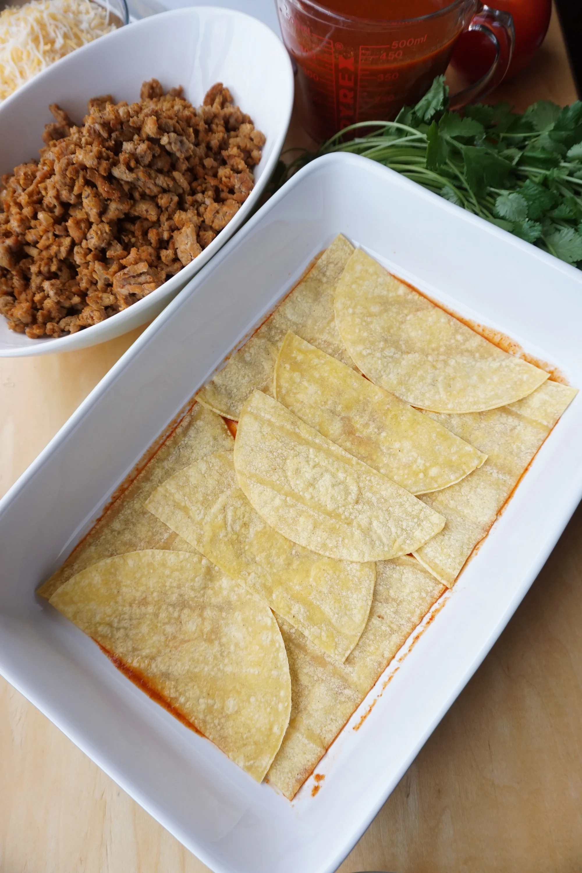 - Start the next layer, exactly the same way. Tortillas, sauce, meat, cheese, sauce.