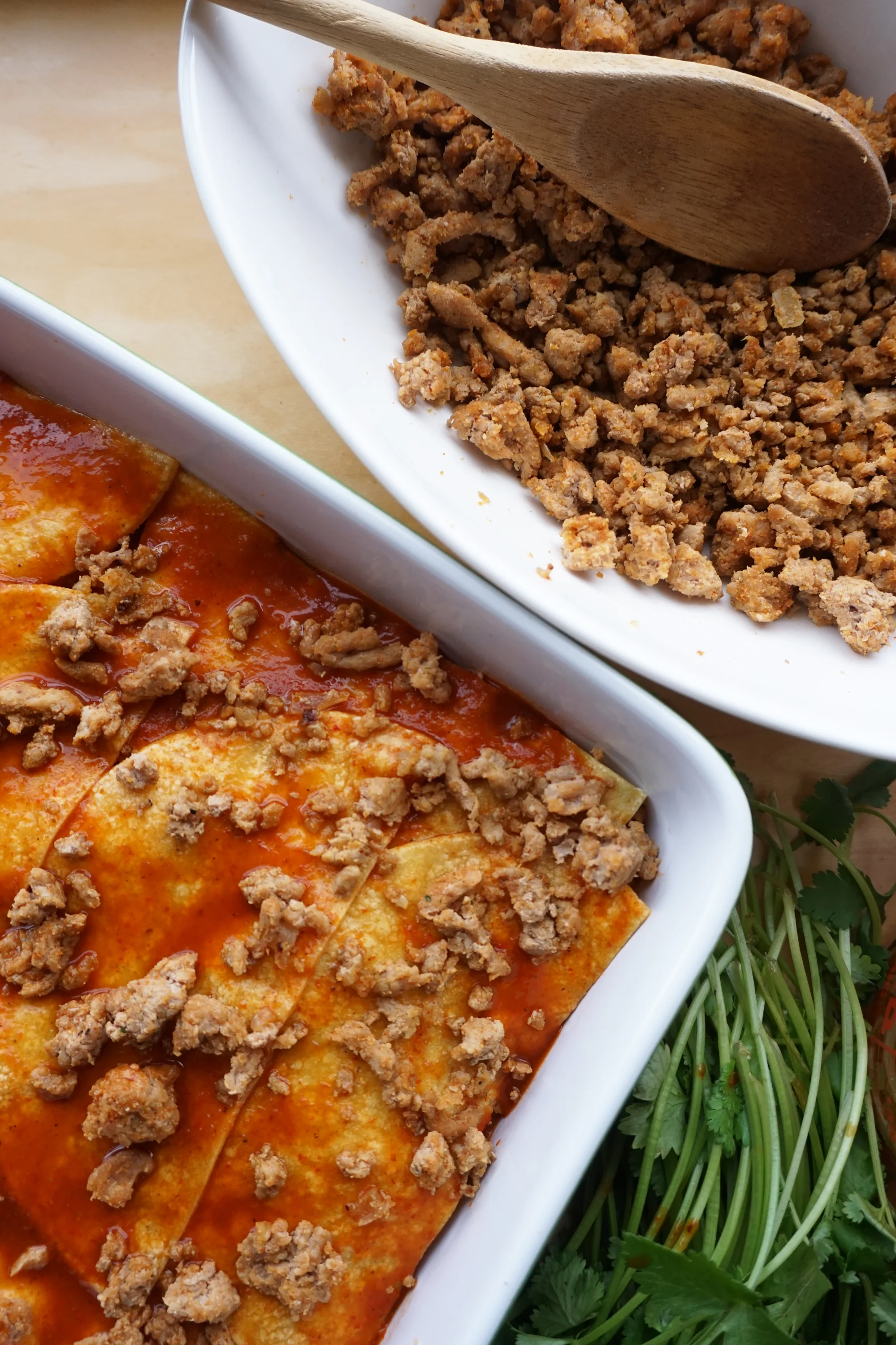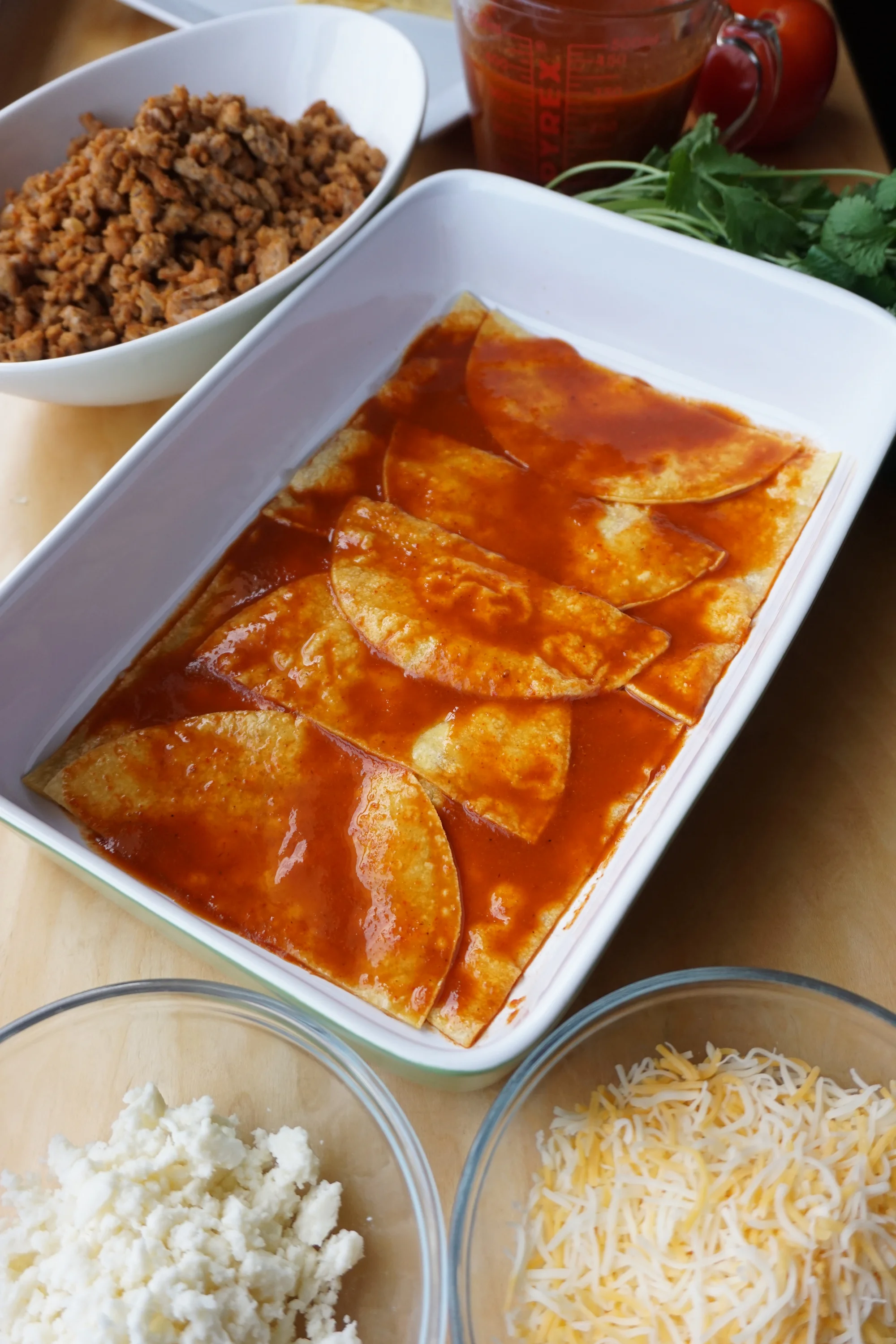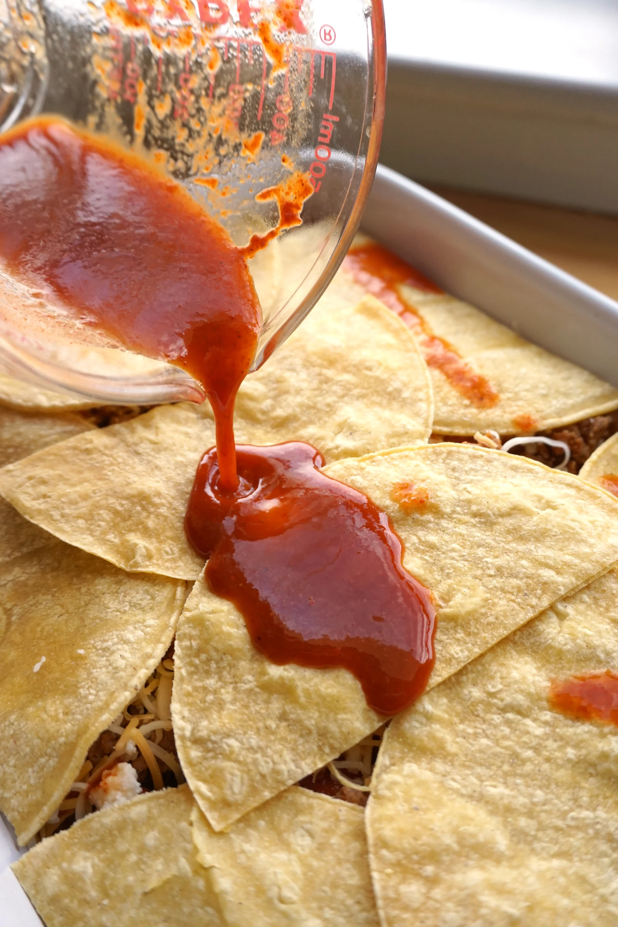 - Start by adding a layer of enchilada sauce in the bottom of the pan.