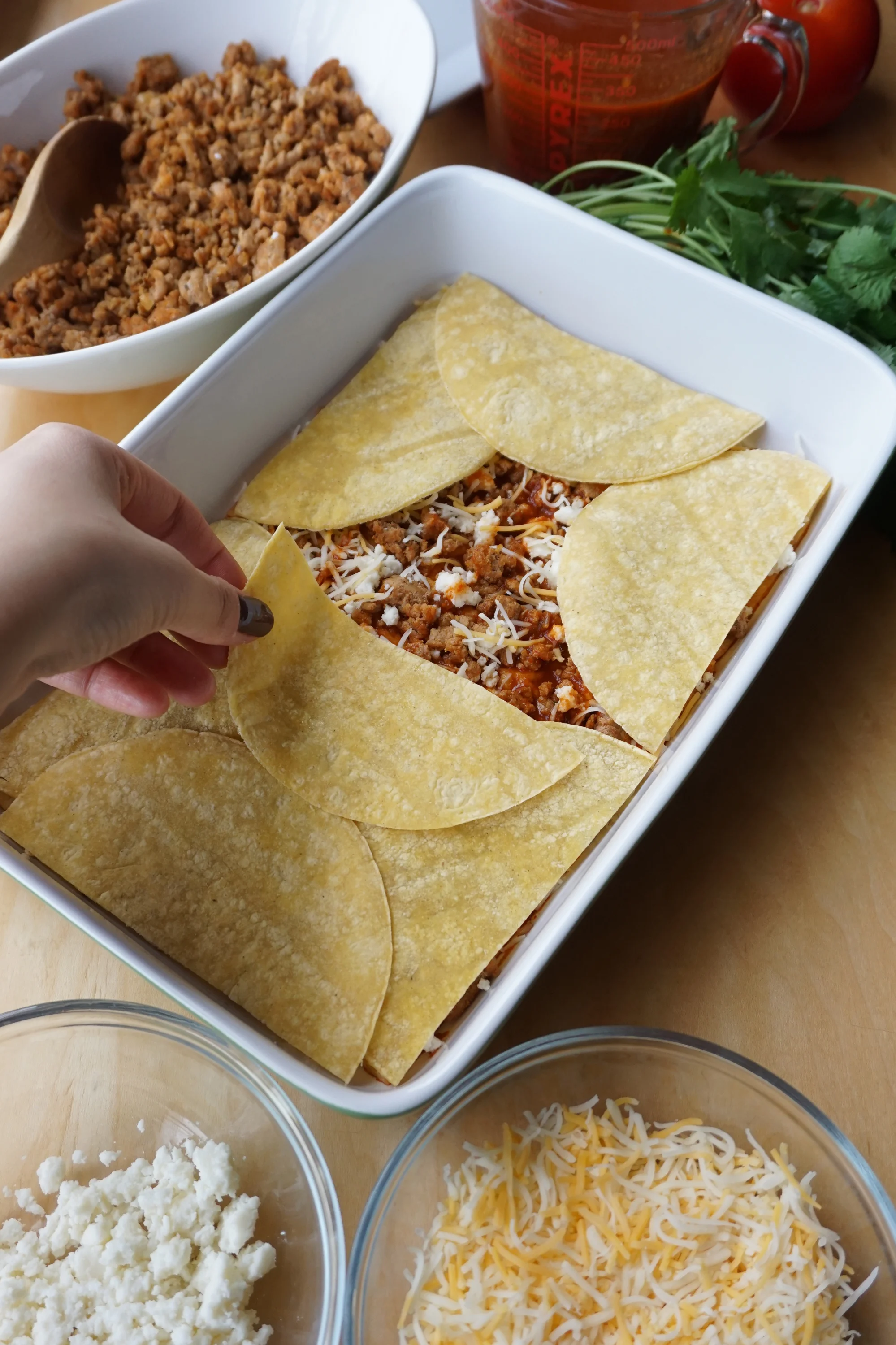- Keep going! I did 3 layers of tortillas. After the third layer, I topped it off the rest of the meat, sauce, and tons of shredded cheese.