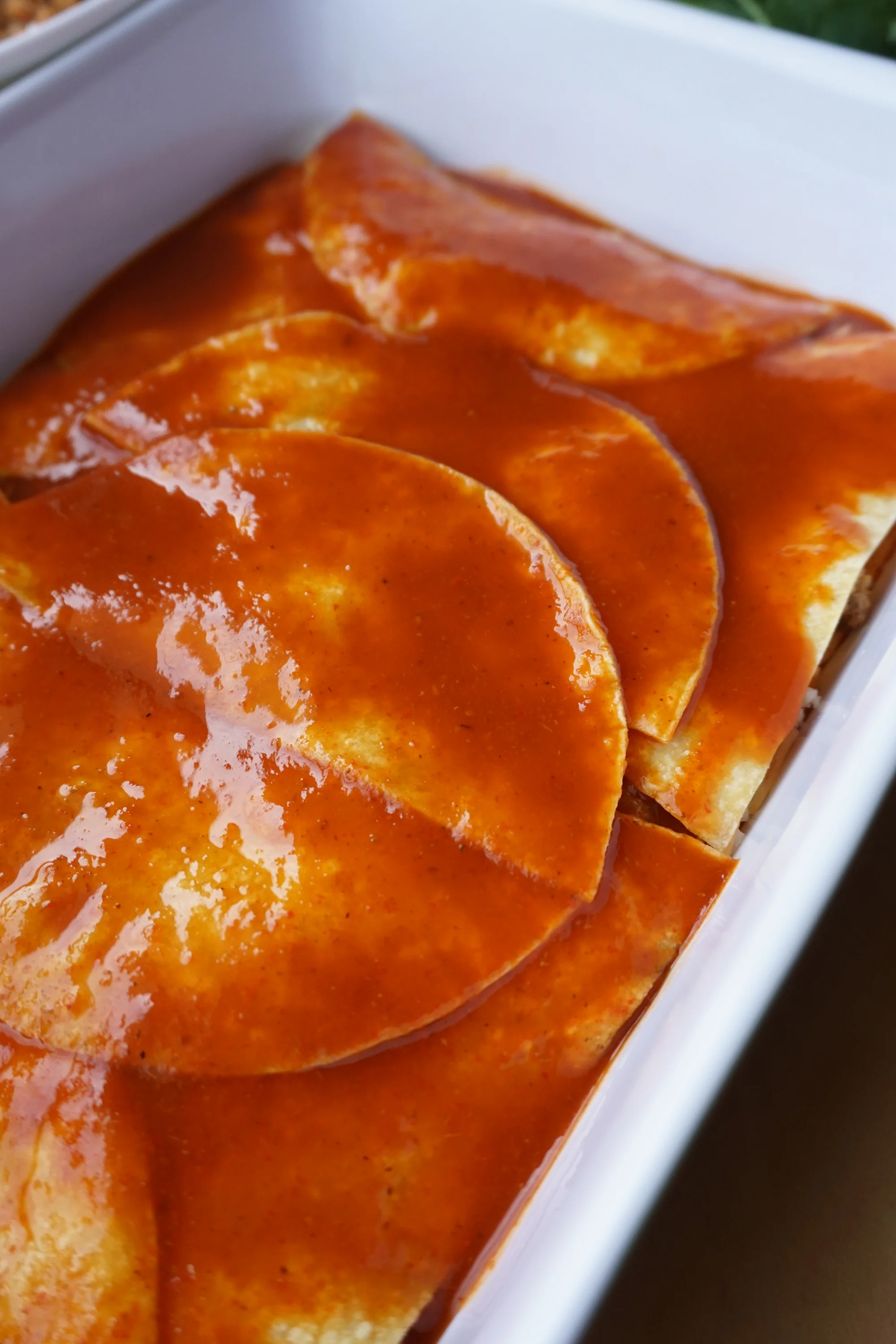 - Pour a layer of sauce on top of the tortillas, ensuring that they’re nicely saturated.