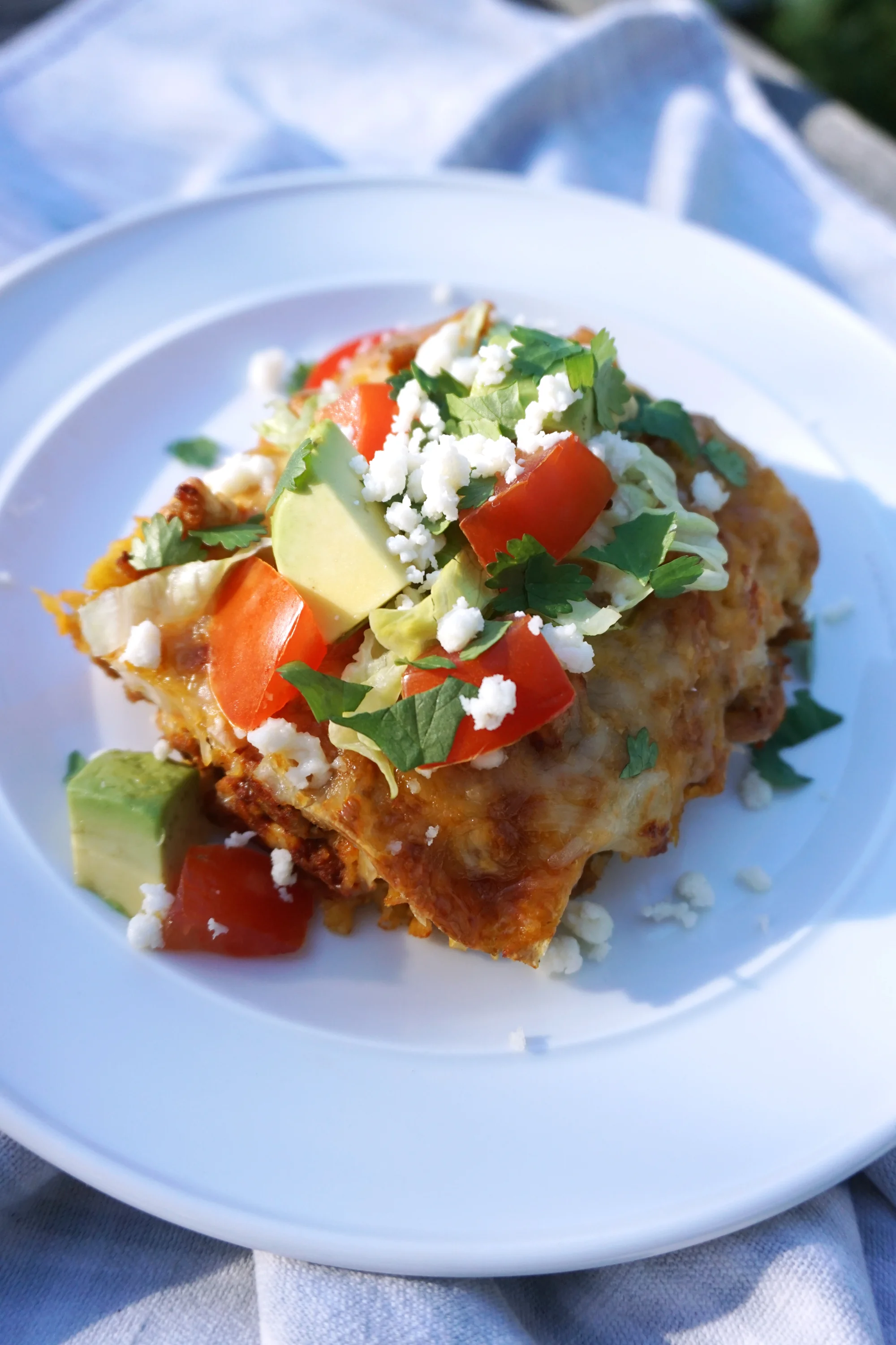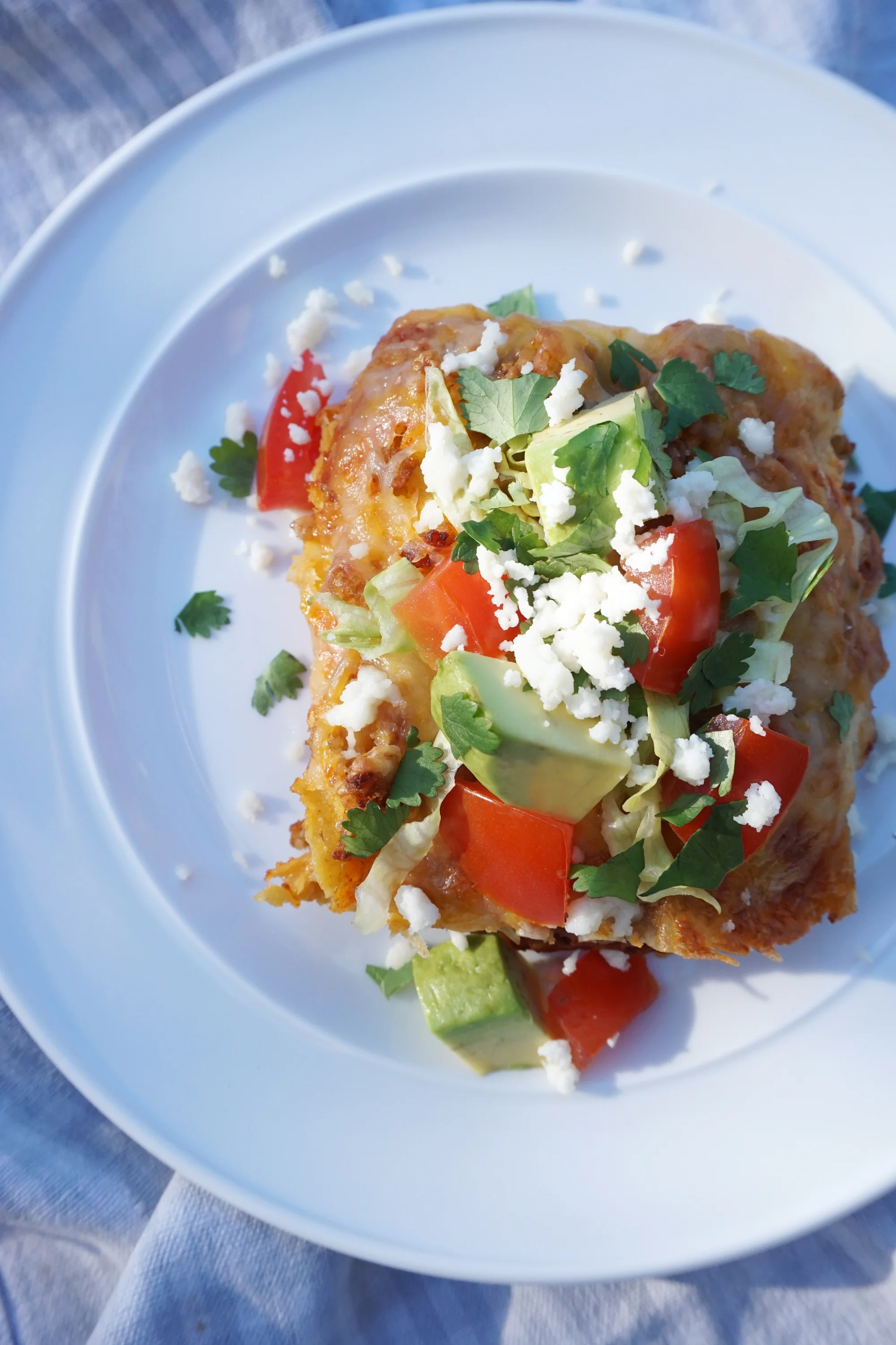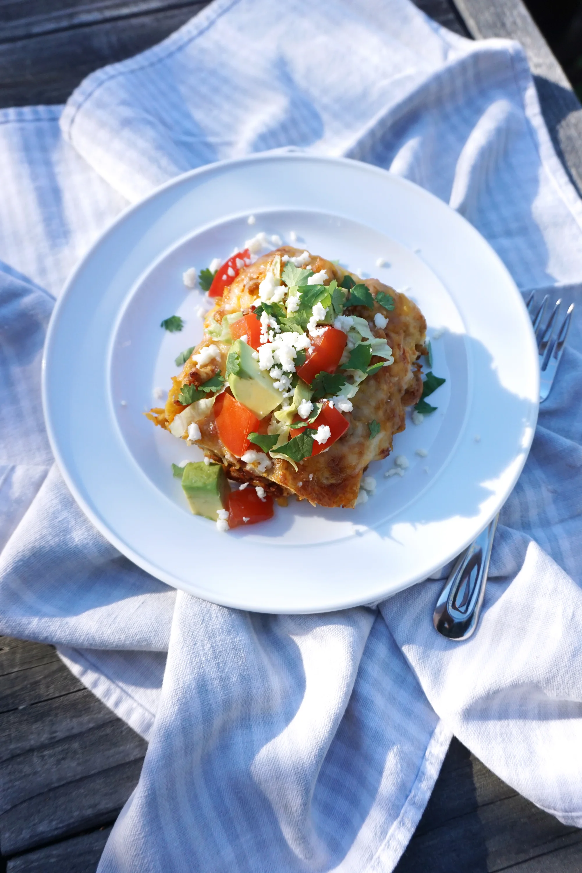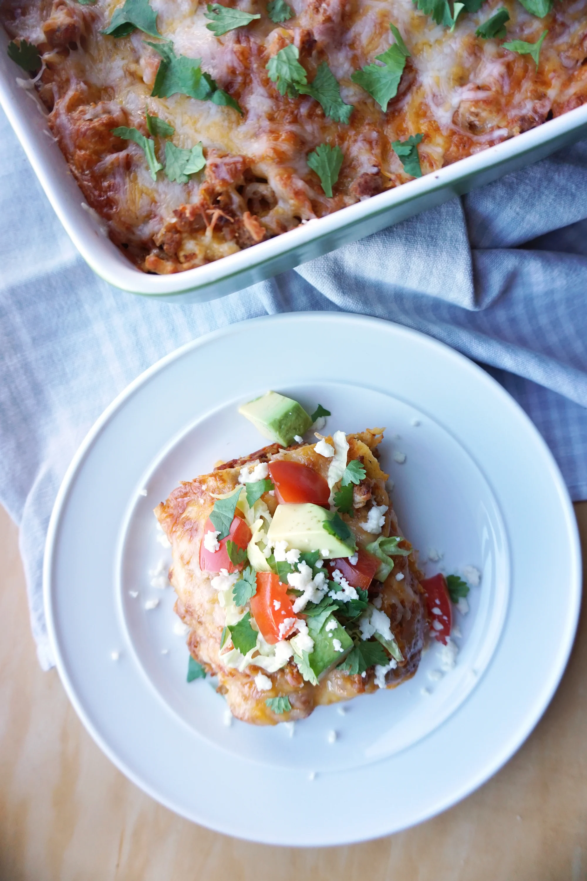 I’m not going to claim that I know how to make authentic enchiladas, or hell, Mexican food. These Enchilada Stacks are a great way to satisfy your craving for Mexican food without the extra work that comes with rolling each enchilada. The recipe is delicious - it tastes just like I remember, and is so easy to throw together. It might not look like the traditional thing, but trust me, it tastes just like the classic. Top off each serving with fresh Queso Fresco, tomatoes, avocado, lettuce, olives, and cilantro - the whole enchilada.